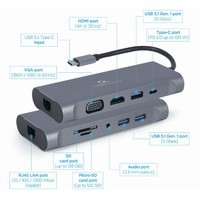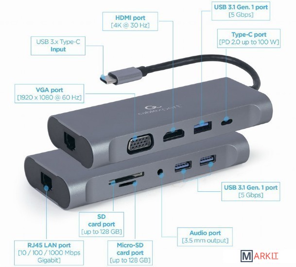 Основные особенности:- 3 портовый хаб USB 3 (5 Гб/сек)- 4K 30 Гц HDMI порт- VGA Full HD видео порт- стерео аудиовыход 3.5 мм- 100 ваттный зарядный порт USB Type-C (Power Delivery)- кардридер флэш-карт памяти SD и MicroSD- стильный и прочный металлический корпус